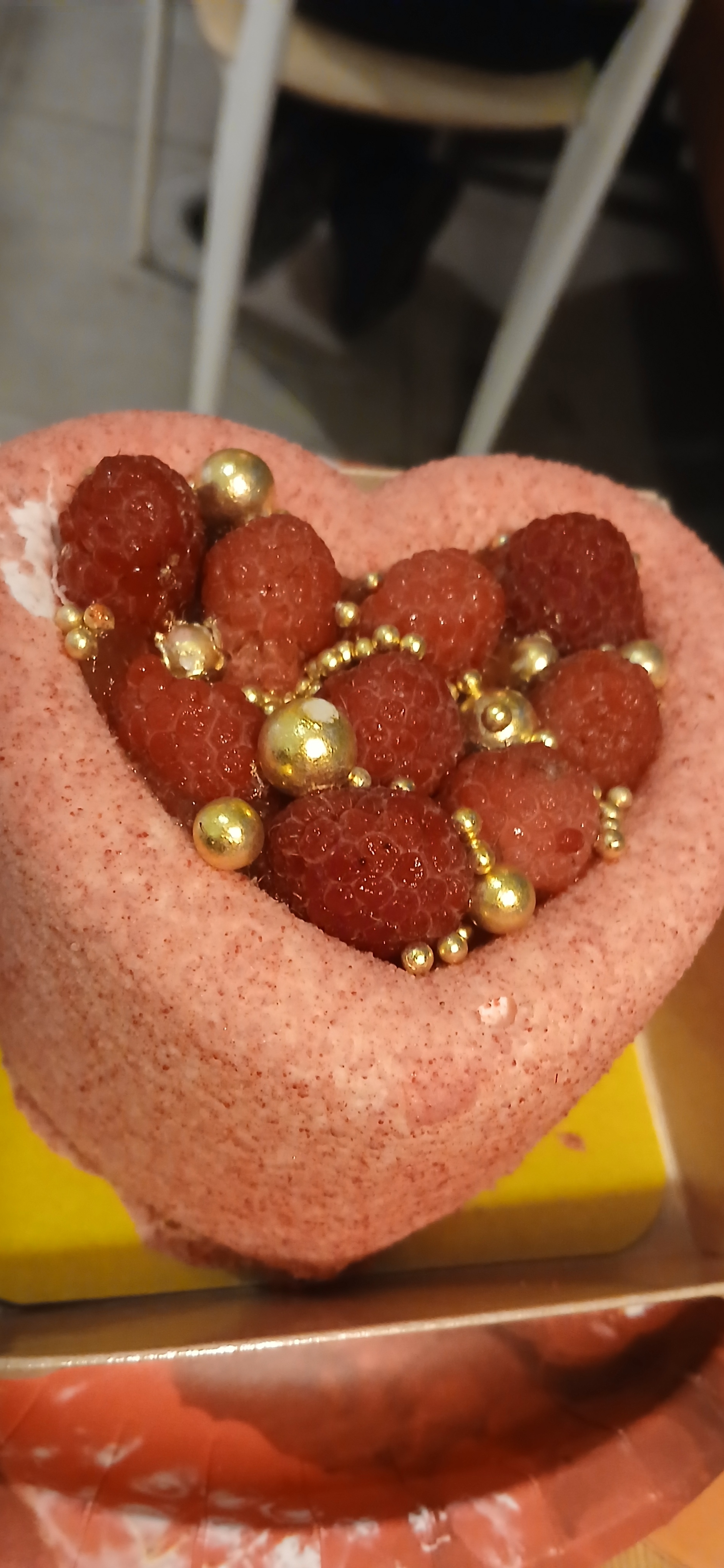 Бенто-торт Праздничный (Сердце с малиной) в индивид.упаковке. Нежный муссовый бенто-торт в форме сердца с начинкой из ананасового конфитюра с кусочками ананаса на тонкой бисквитной подложке. Торт украшен спелыми ягодами малины и золотым декором.